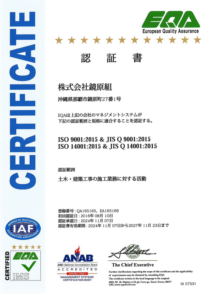 平成13年に品質マネジメントシステムを、平成18年に環境マネジメントシステムを認証取得し、運用しております。